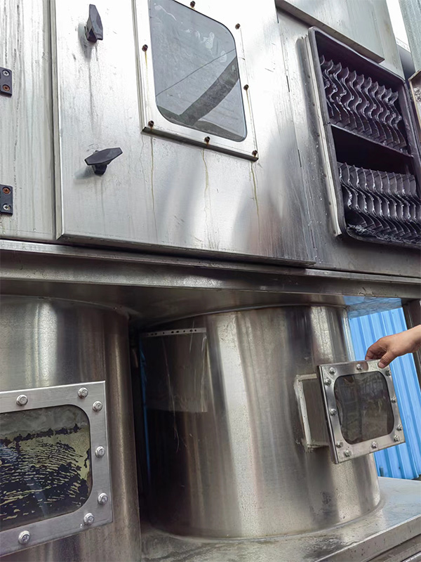 气旋塔内安装有若干个“圆形旋流桶”和高效除雾板。旋流桶内放有实心填料球,上层的除雾板用来净化水雾,达到脱水雾的目的,含尘气体在塔内旋流上升、并在各板上与由塔顶进入的液体旋流接触,完成除尘任务;通过离心力的作用,废气中的大颗粒沉入水池, 后由人工捞出清理机壳,这样气体得到净化,达标排放,同时气旋塔内的水可以继续循环使用。