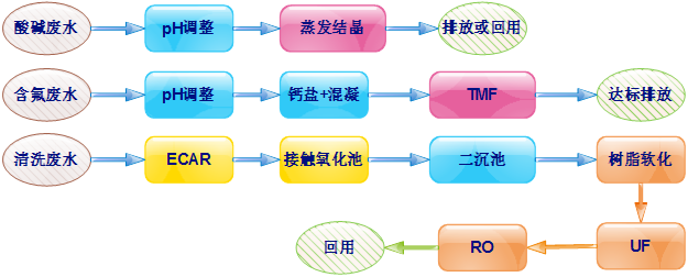 清洗废水含有高浓度有机物,采用ECAR+接触氧化法,实现污染物的降解和脱氮, 继而通过树脂软化+UF+RO达到废水的回用,实现经济效益和环境效益的统一。