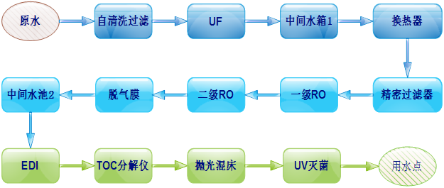采用UF+二级RO+EDI+ TOC+混床单元组合工艺,这是一种制取超纯水的最新的、稳定的工艺,也是一种最环保、经济、发展潜力巨大的超纯水制备工艺。