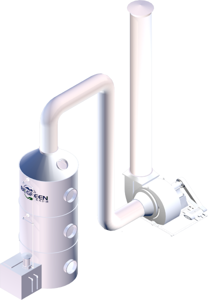 设备结构:通常结构形式分单塔体和双塔体或立式及卧式。由贮液箱、塔体、进风段、喷淋层、填料层、旋流除雾层、出风锥帽、检修孔等组成。其具有结构新颖、处理风量大、压力降小、净化效率、灵活性大等特点。
